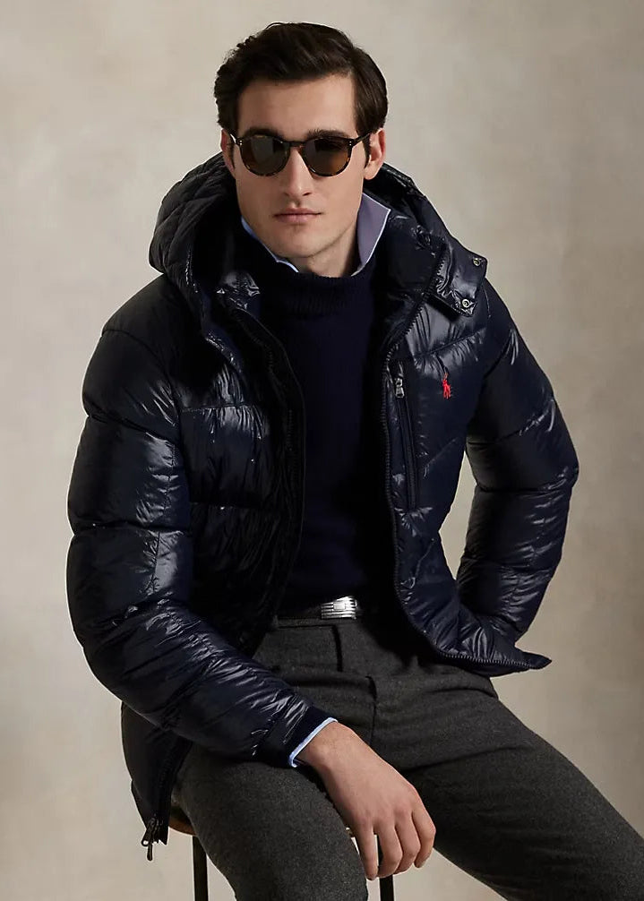 - Mockneck. Zip-off drawstring hood. Two-way full-zip front with a storm guard and a flap at the top that prevents chafing. Zipper pulls custom-developed with an "RL" logo.